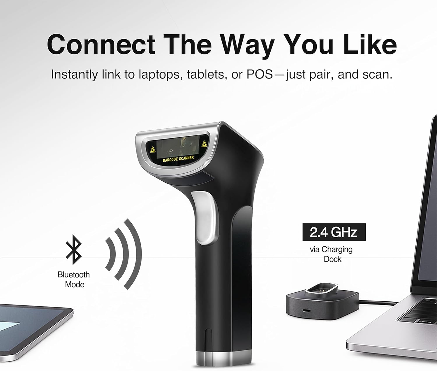 - SMART WIRELESS FLEXIBILITY: Two options: Bluetooth barcode scanner for iOS, Android, macOS, Windows, and Linux, or 2.4 GHz wireless via the charging stand, which connects to your computer with a USB cable.