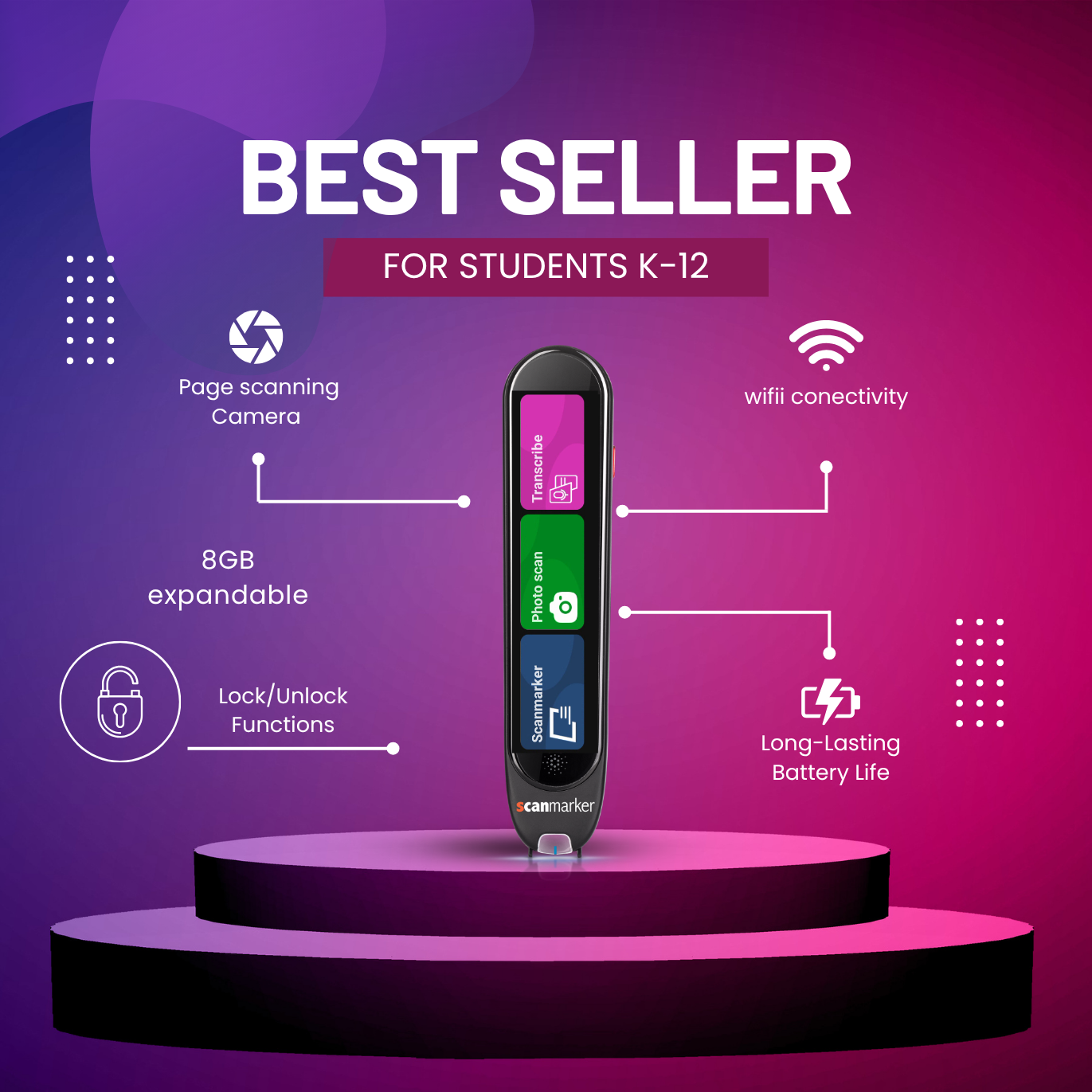 Scanmarker Max includes all functions of the Scanmarker Pro and adds advanced tools for educators and exam settings — including lock/unlock control for secure use. It’s built for classrooms, exams, and professional users who need precise scanning, transcription, and translation in one portable device.